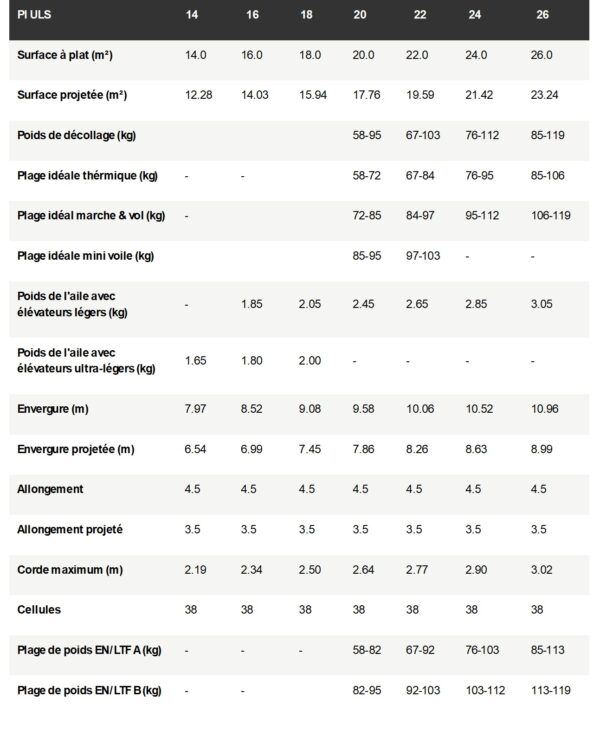 - La philosophie ULS : les matériaux haut de gamme les plus légersÀ partir de la taille 20 m², la PI ULS sera désormais livrée avec des joncs en Nitinol et un tissu Dominico D10 sur l’intrados. Cela réduit considérablement le poids et le volume une fois pliée. L’extrados des plus grandes tailles est toujours fabriquée en Skytex 27 g, plus résistant au glissement, ce qui facilite la manipulation sur les décollages glissants. Pour les plus petites tailles jusqu’à 18 m², le mélange de matériaux éprouvé reste inchangé.