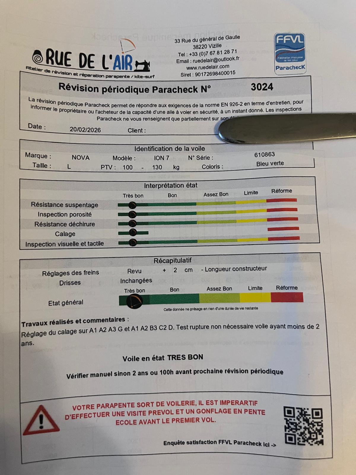 Marque : NOVA, Modèle : ION 7 LIGHT, Homologation : EN B (Low) Allongement : 5.17, Année : Novembre 2025 État neuf 20 vols ploufs en hiver, moins de 8h de vol – Contrôle très bon état et prête à voler