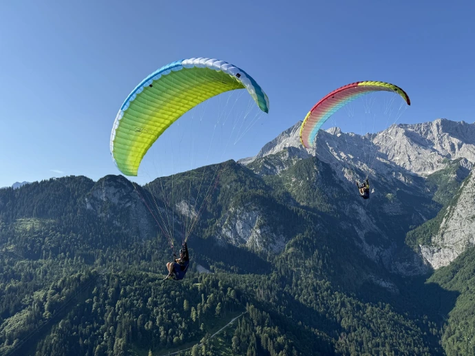 Les suspentes colorées sautent aux yeux dès que l’aile est dépliée – très pratique au déco, mais aussi en vol. Dans le même esprit, les élévateurs sont équipés de repères indiquant les lignes pour les oreilles ou le B-stall. Au gonflage, la voile monte de façon régulière et fiable, sans accrocher ni dépasser. En l’air, on remarque la course de frein volontairement longue de la RIMO 2. La pression de commande progressive se manie intuitivement et limite les fermetures accidentelles. Malgré tout, la RIMO 2 tourne volontiers et donne envie d’exploiter les ascendances. Le vol accéléré est également agréable. Et l’atterrissage se fait en douceur, avec un joli arrondi.