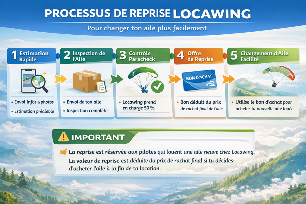 La reprise Locawing est réservée aux pilotes qui louent une aile neuve chez Locawing. La valeur de reprise est déduite du prix de rachat final si tu décides d’exercer ton option d’achat à la fin de la location.